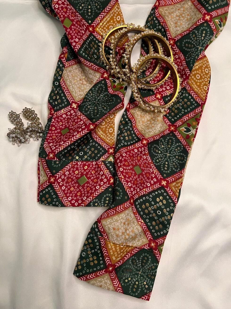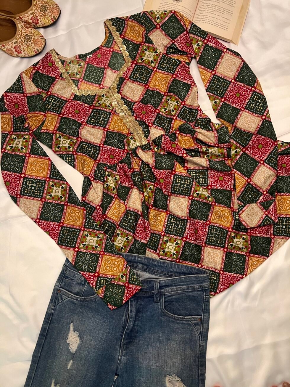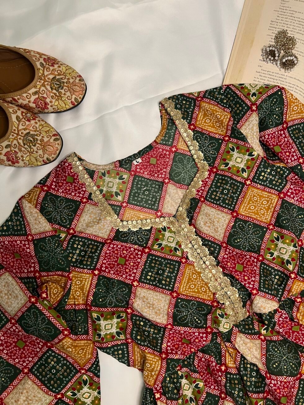 1. Vibrant Bandhni Print: This lightweight rayon kurti showcases an eye-catching bandhni print, adding a traditional touch with a contemporary flair, perfect for festive occasions or casual outings.