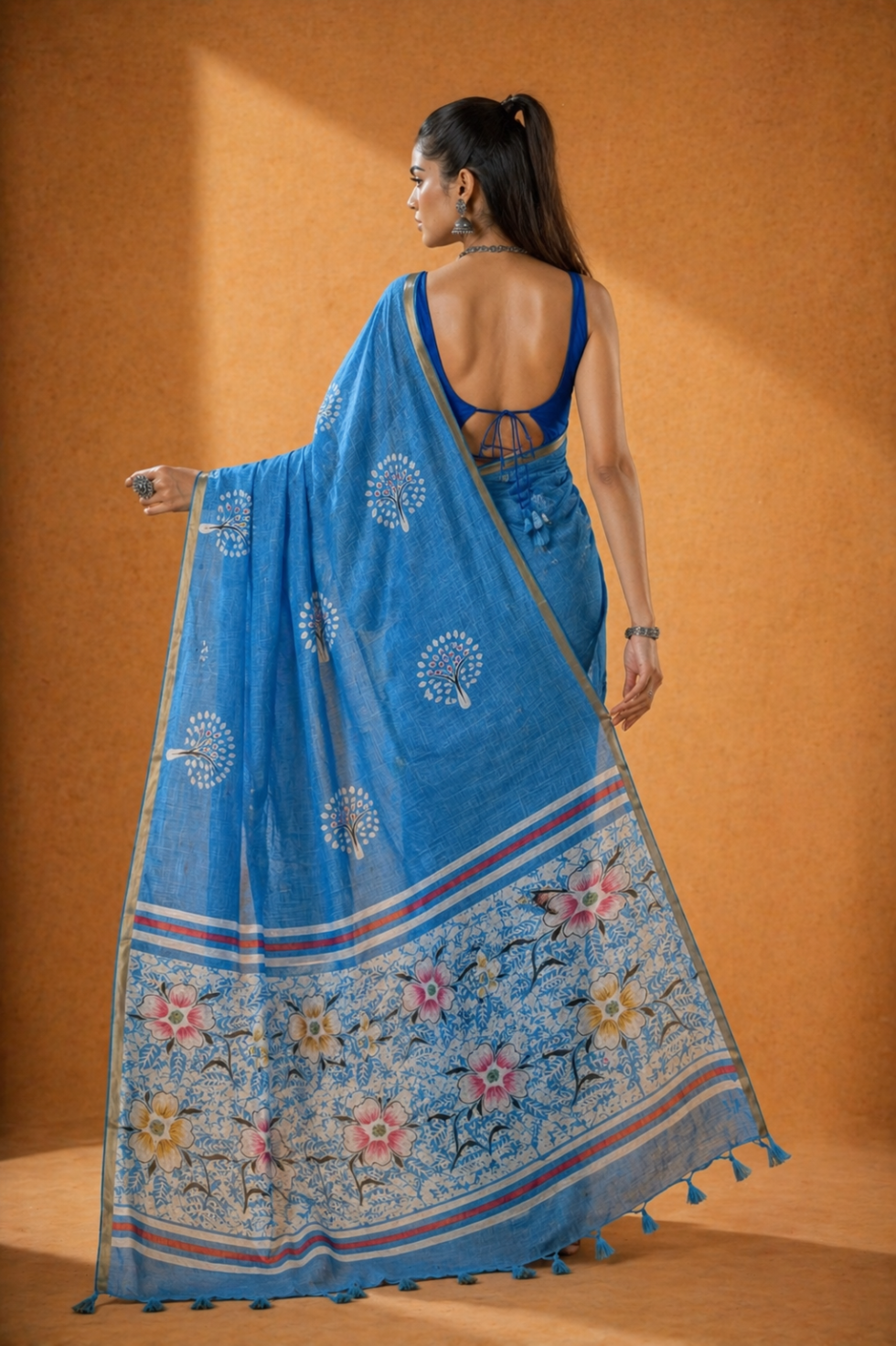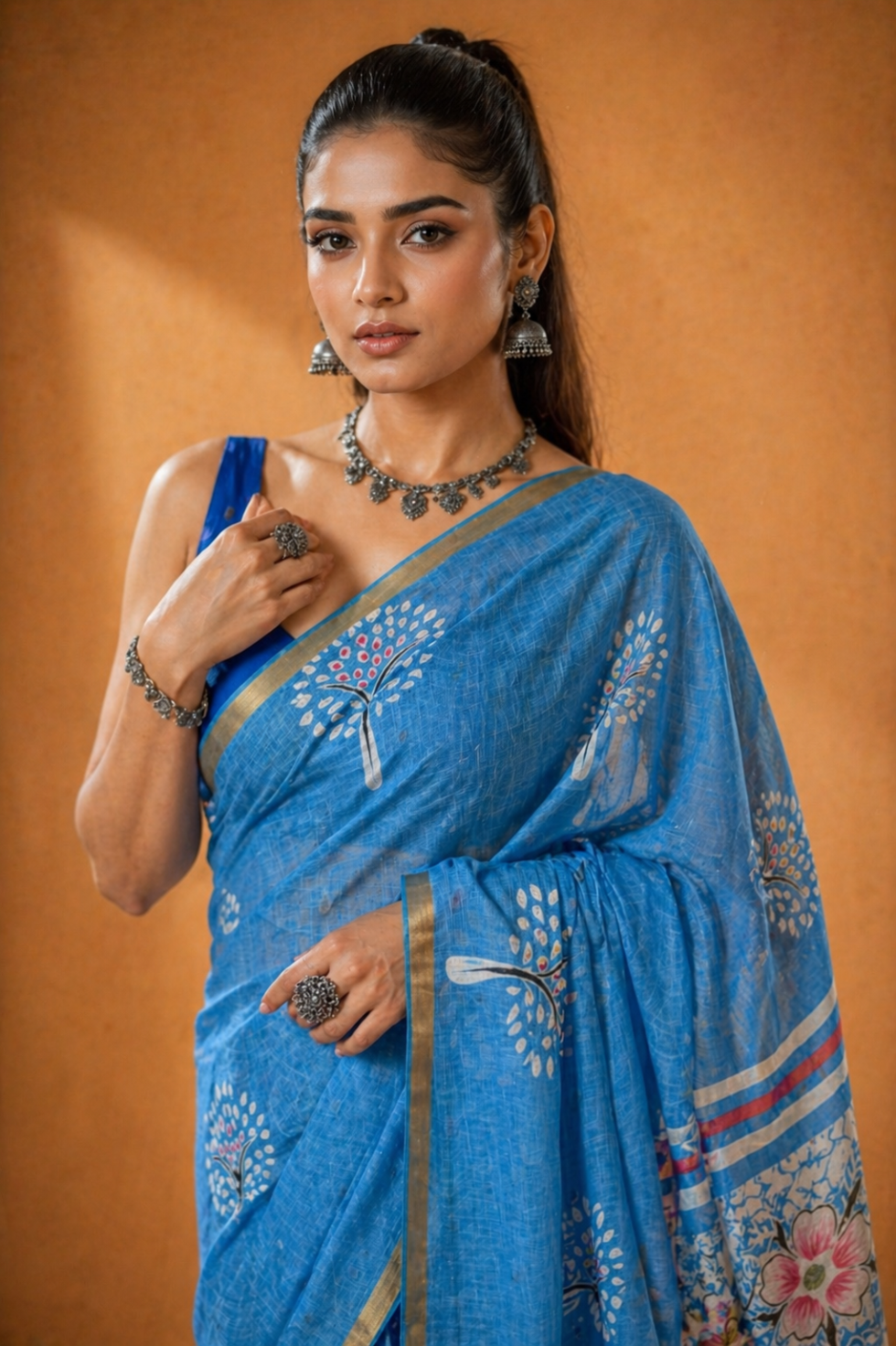 • Elegant Everyday Charm – Crafted from breathable linen cotton, this saree offers a perfect blend of comfort and sophistication, ideal for both casual outings and graceful day events.