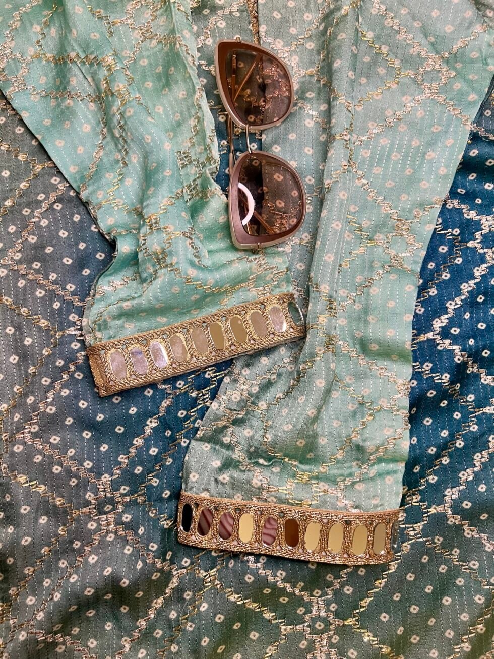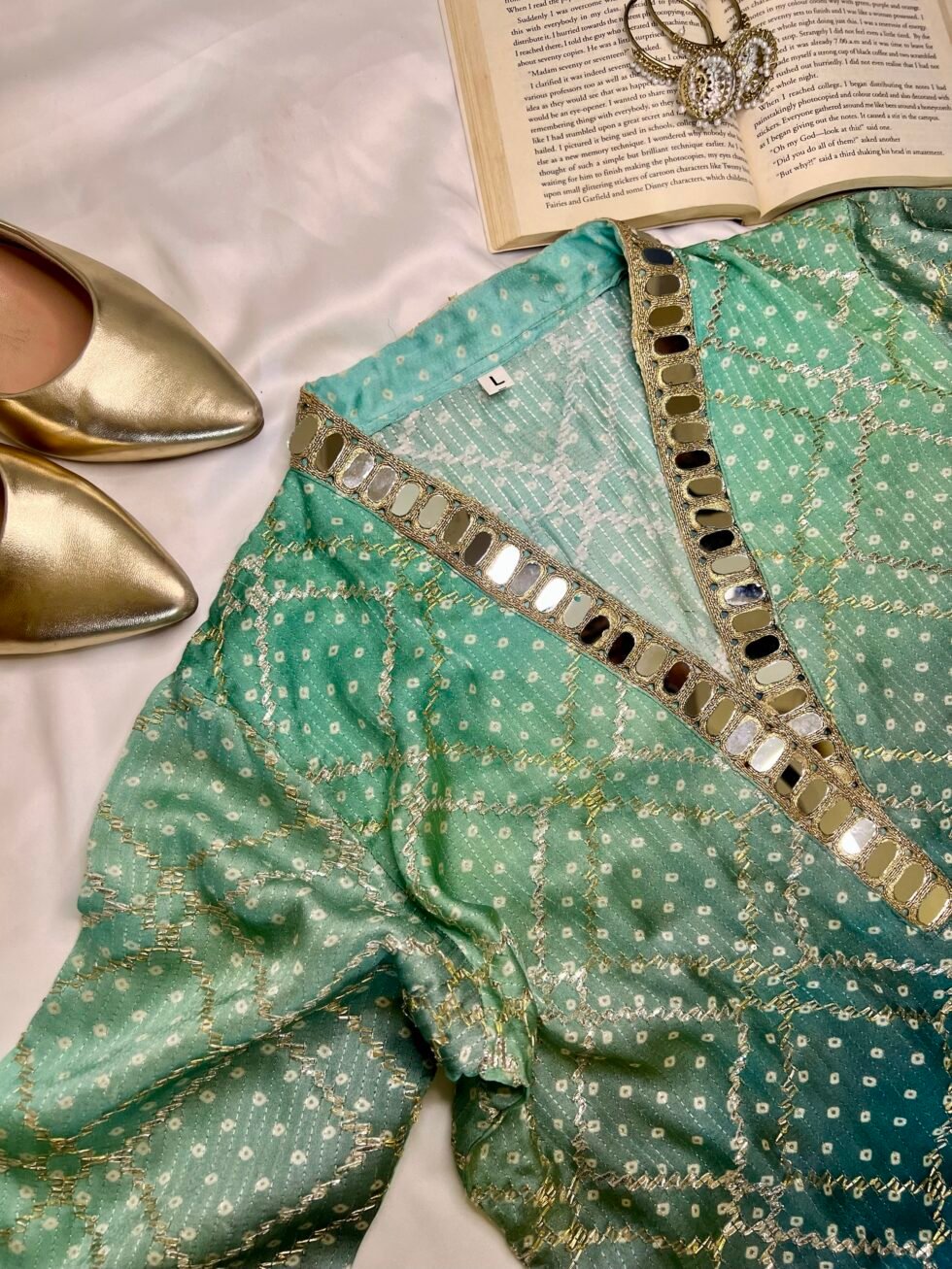 - Features a stunning green ombré bandhej pattern, beautifully highlighted with intricate mirror work on the neckline and cuffs.