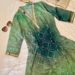 - Features a stunning green ombré bandhej pattern, beautifully highlighted with intricate mirror work on the neckline and cuffs.