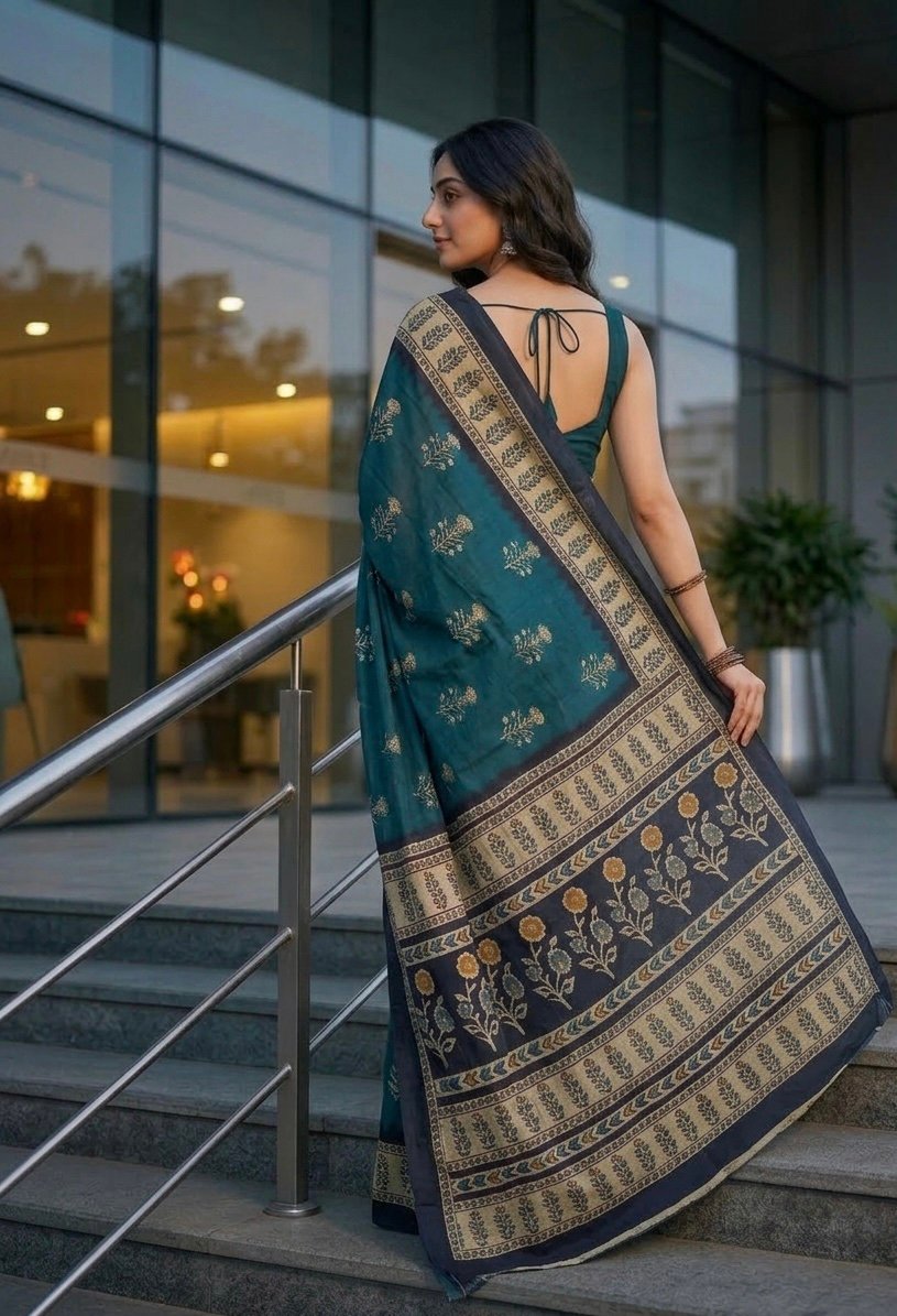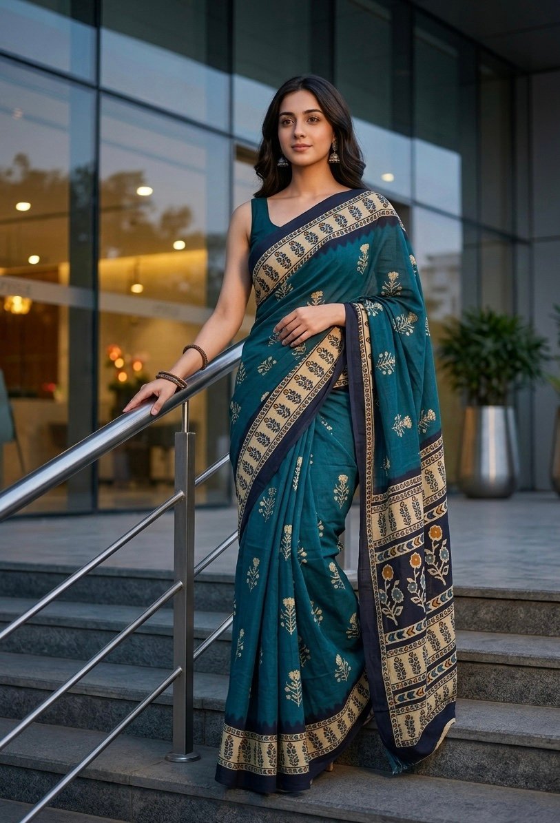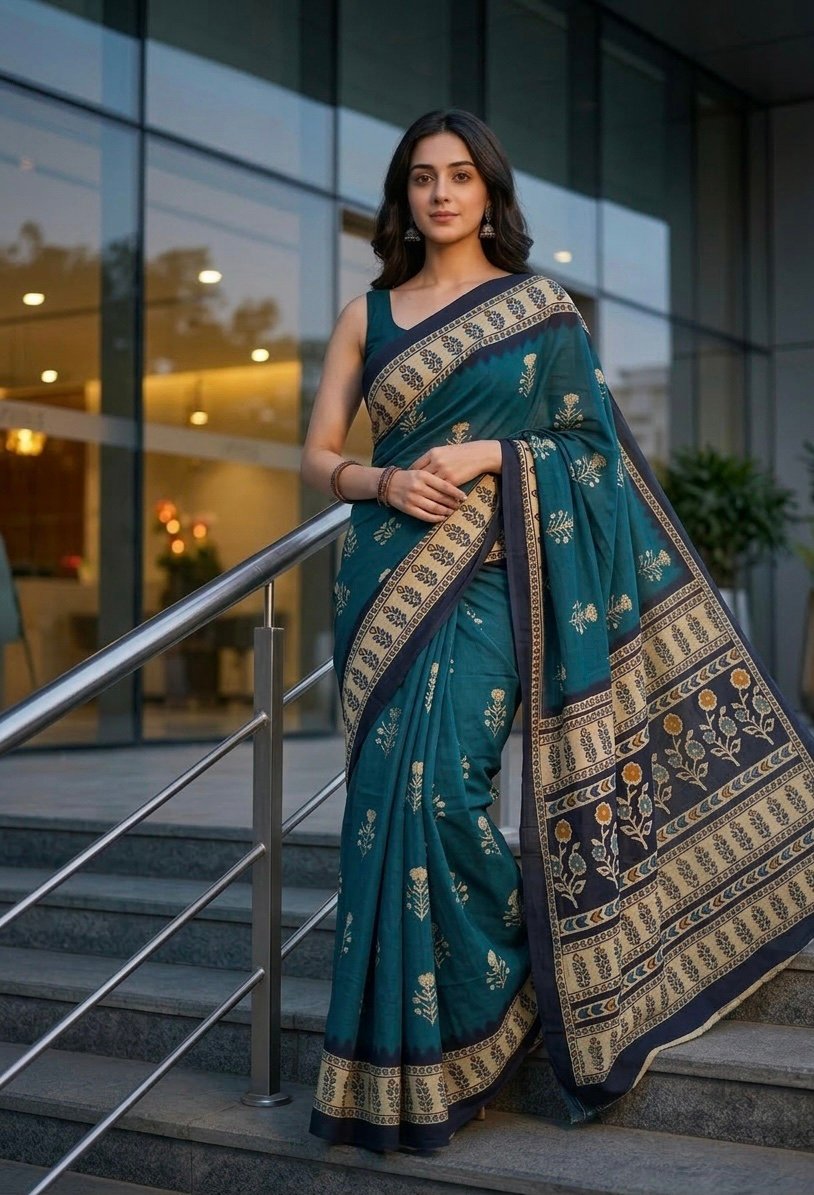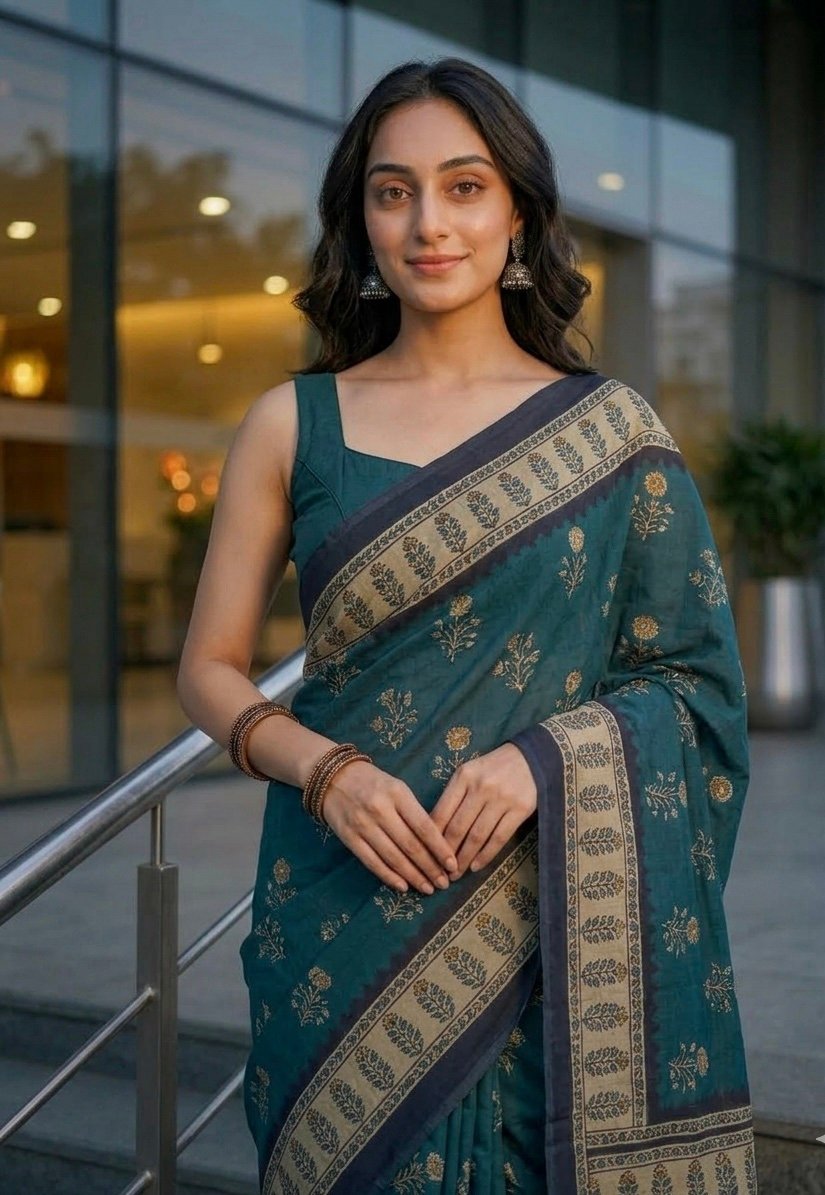 - The Elegant Teal Charm – Crafted from soft breathable cotton in a rich emerald teal shade, adorned with delicate traditional motifs that give the saree a graceful everyday-luxury appeal.