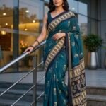 - The Elegant Teal Charm – Crafted from soft breathable cotton in a rich emerald teal shade, adorned with delicate traditional motifs that give the saree a graceful everyday-luxury appeal.