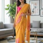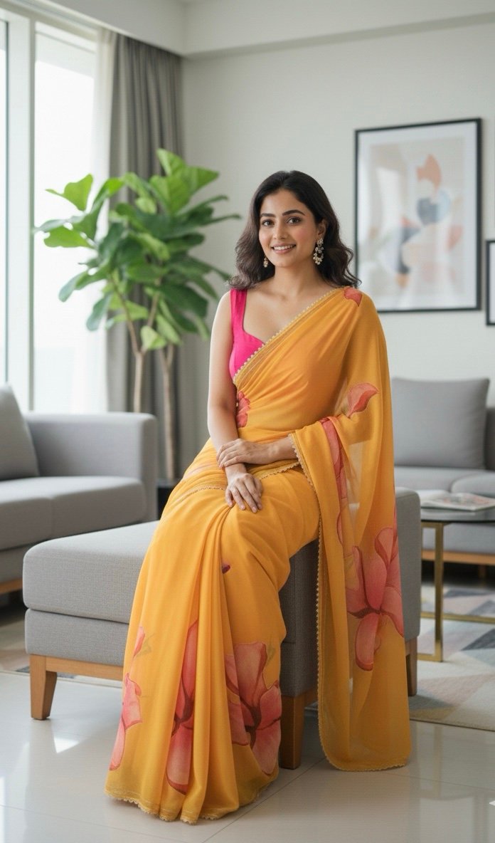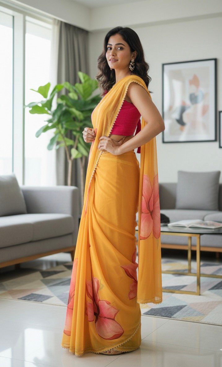 - Crafted in lightweight yellow organza, this saree radiates festive elegance with its sheer, glossy texture.