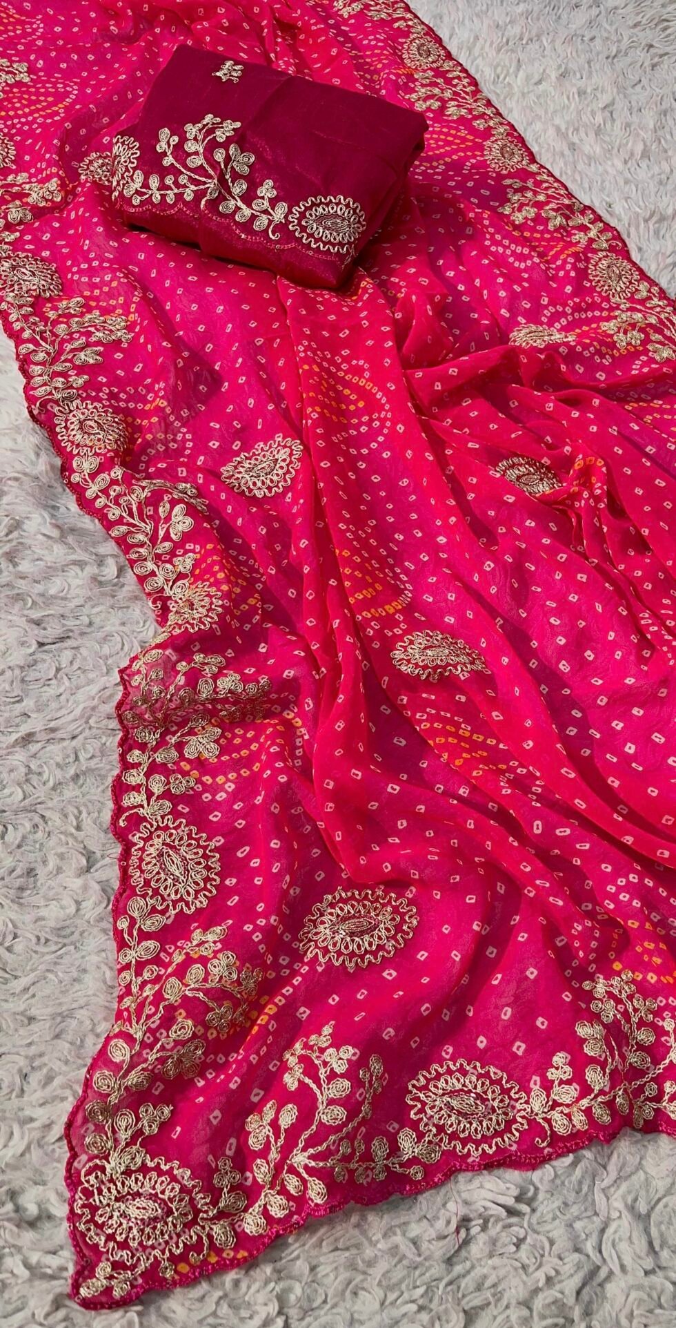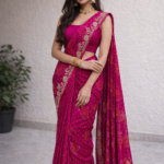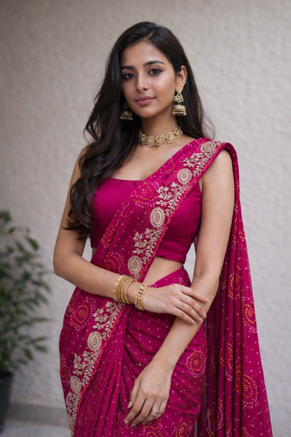 • Crafted in lightweight georgette fabric, this saree features elegant leheriya-inspired swirl patterns that create a graceful, flowing look.