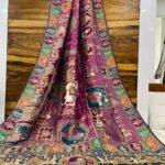 - Crafted from luxurious Banarasi silk, this saree showcases intricate woven motifs depicting royal scenes and traditional artistry in rich multicolor threads.
