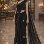 • The classic black shade paired with a stylish blouse creates a bold, elegant look ideal for parties, receptions, and evening occasions.