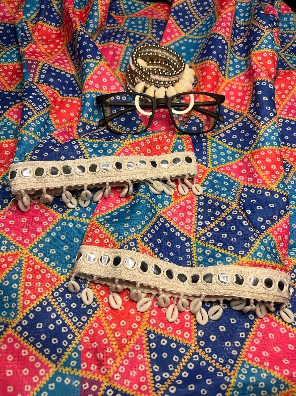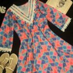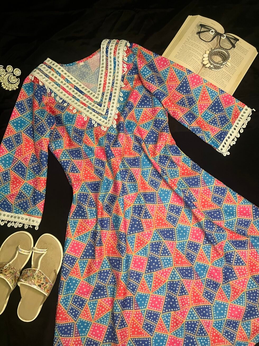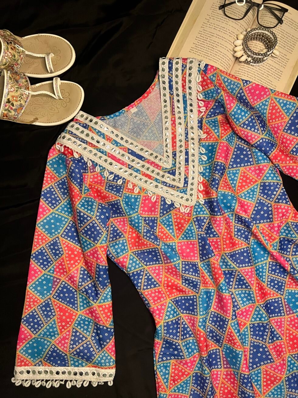 - Adorned with a lively geometric bandhej-inspired print in shades of pink, blue, orange, and teal for a youthful vibe.