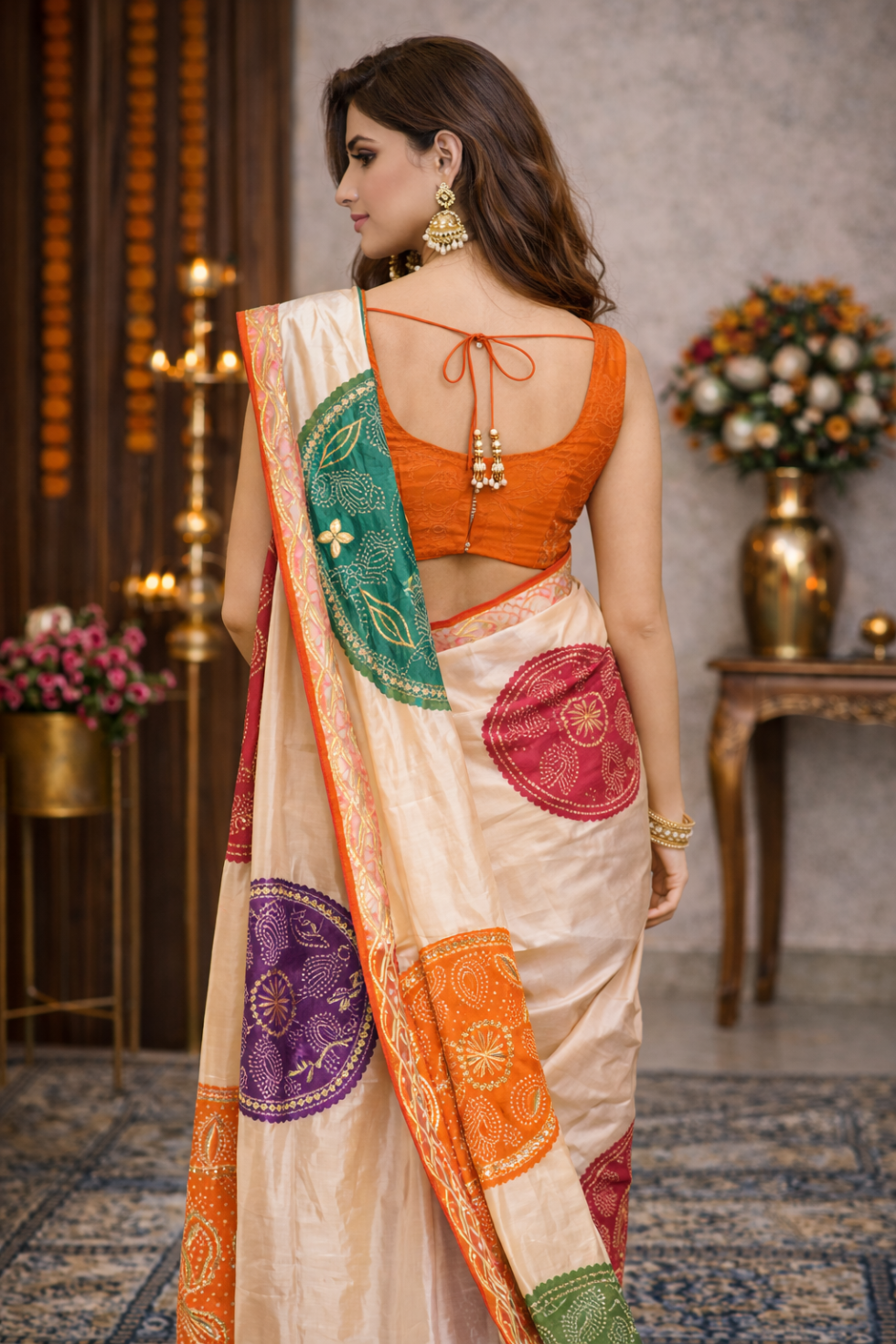 - Crafted in premium Gajji silk, this saree features vibrant bandhani-inspired circular motifs that celebrate rich Indian craftsmanship.