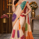 - Crafted in premium Gajji silk, this saree features vibrant bandhani-inspired circular motifs that celebrate rich Indian craftsmanship.