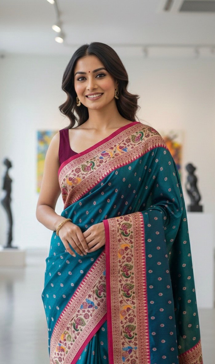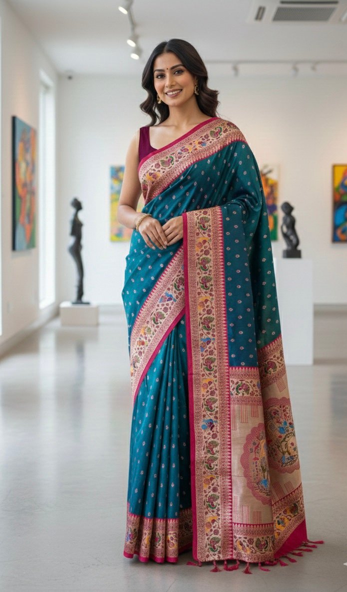- Rich peacock Paithani silk body adorned with delicate golden butti motifs for a graceful, timeless appeal.