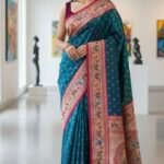 - Rich peacock Paithani silk body adorned with delicate golden butti motifs for a graceful, timeless appeal.