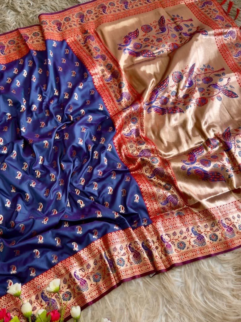 - A stunning blend of deep royal blue and soft gold, adorned with intricate paisley motifs and exquisite zari detailing.