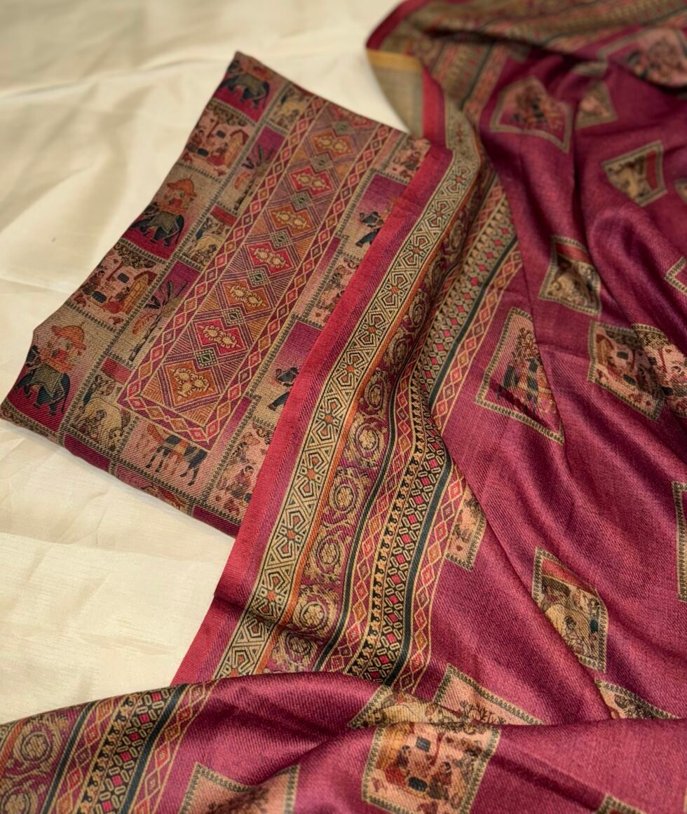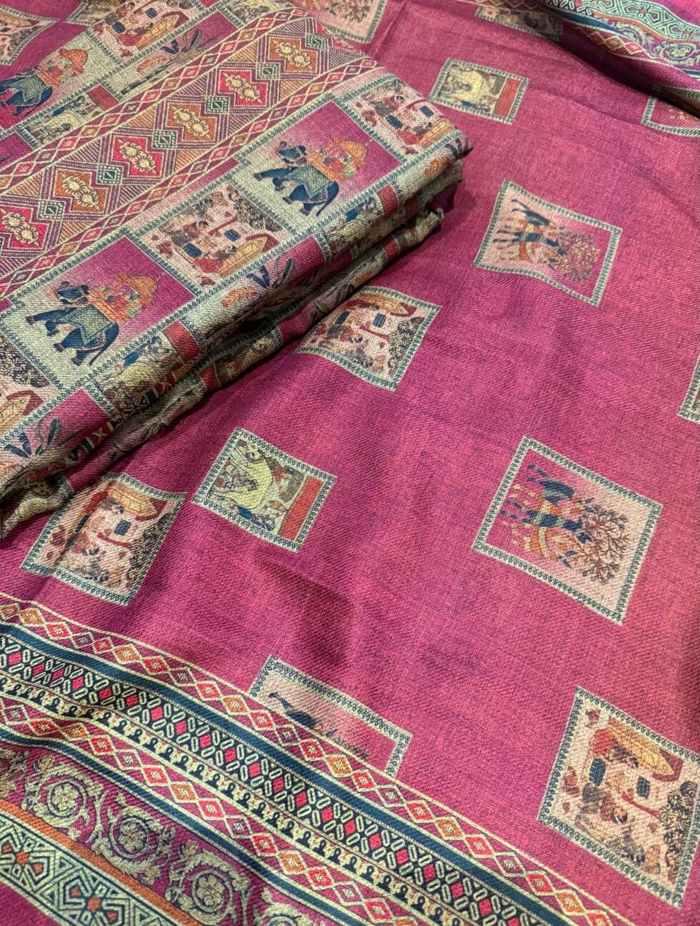 - Intricate Traditional Motifs: Adorned with beautifully woven ethnic scenes, elephants, and royal artwork that give the fabric an elegant, heritage-inspired charm.