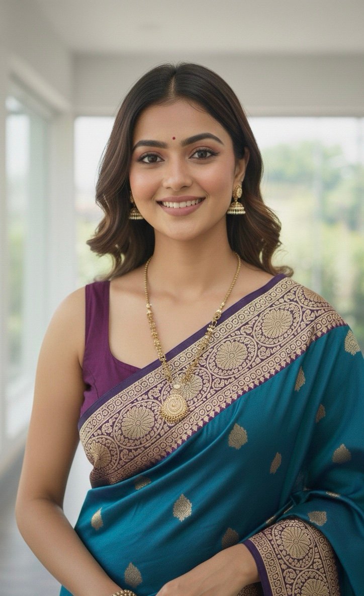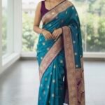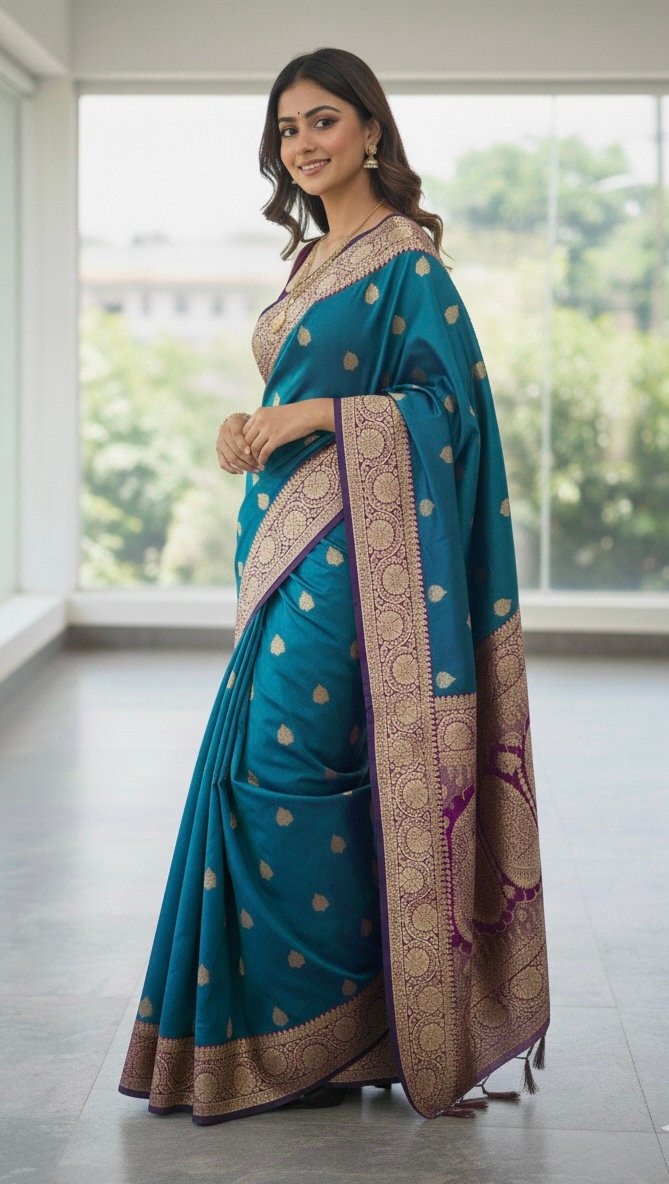 - Crafted in a rich teal hue, this Banarasi saree radiates elegance with its smooth, luxurious drape and timeless appeal.