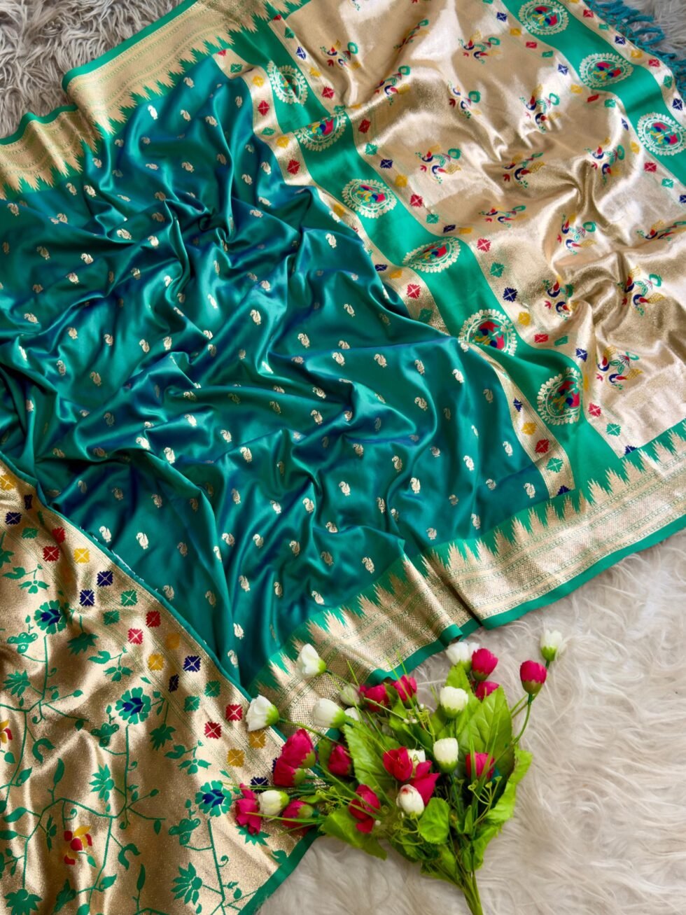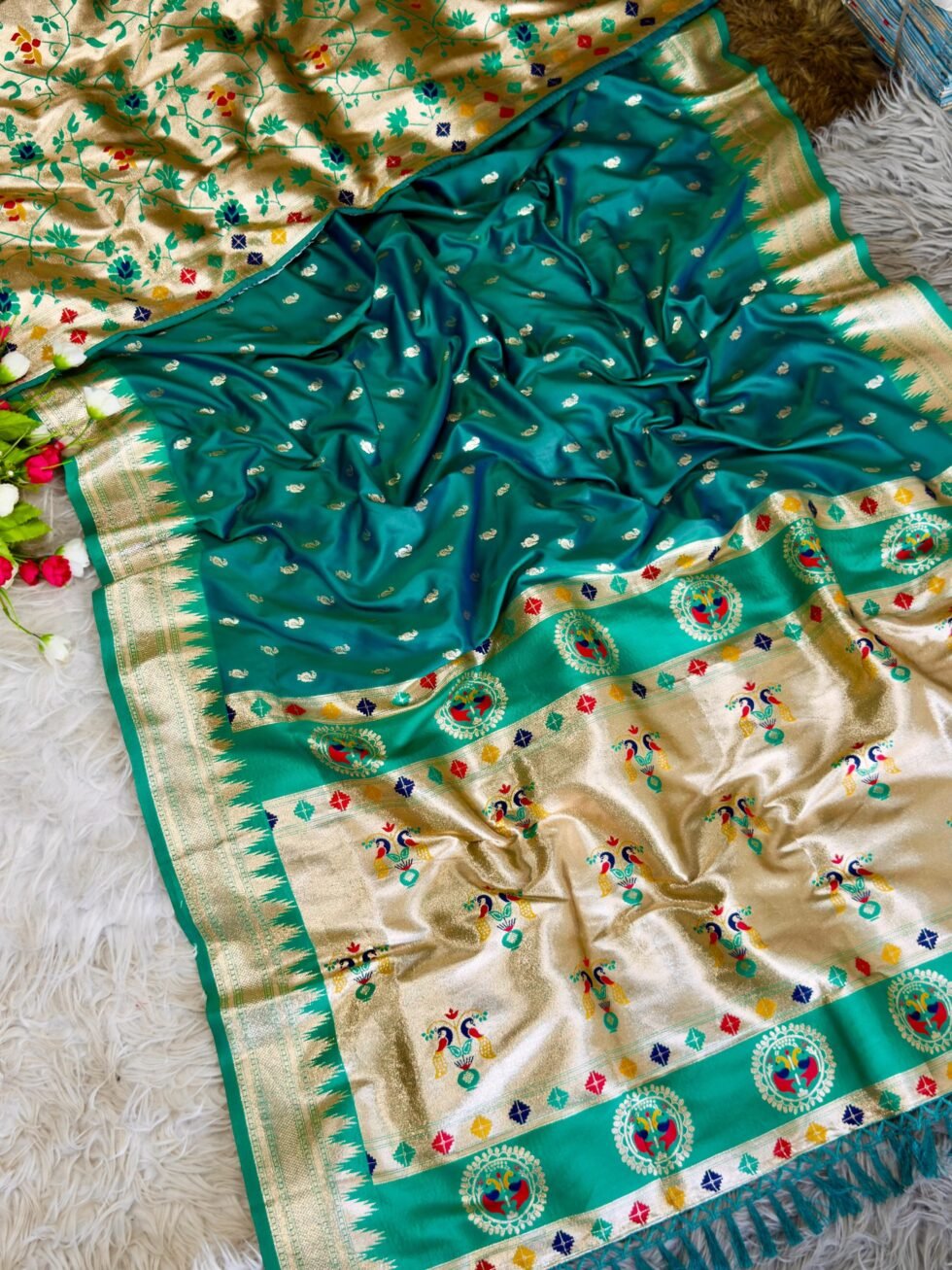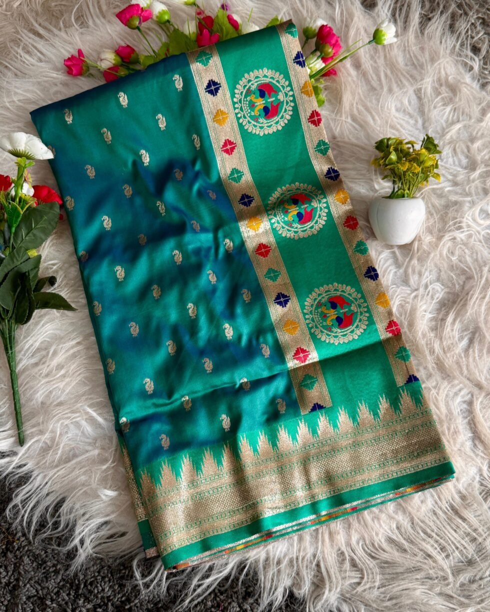 - This saree features a luxurious emerald body crafted from art silk, adorned with intricate golden zari motifs and a broad embellished border for a regal appeal.