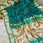 - This saree features a luxurious emerald body crafted from art silk, adorned with intricate golden zari motifs and a broad embellished border for a regal appeal.