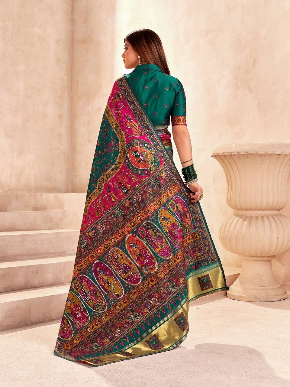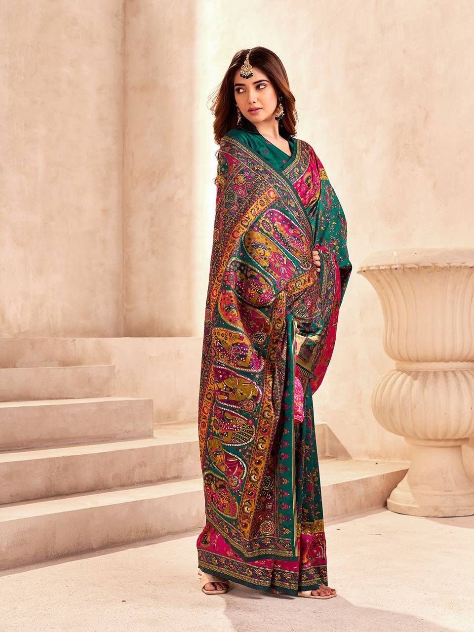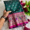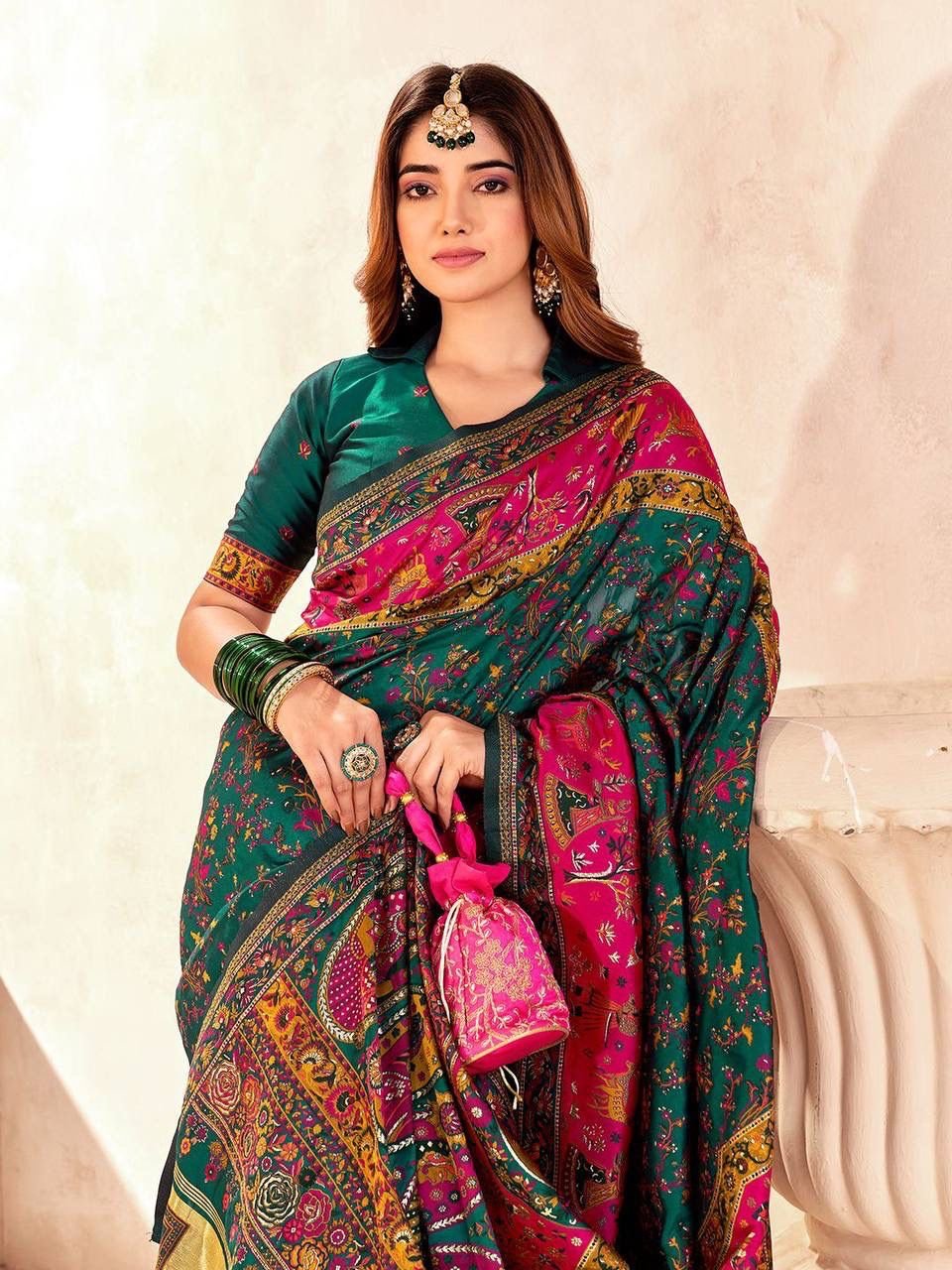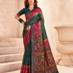 - Woven in luxurious pashmina silk, this saree features a rich emerald green base with vibrant magenta accents, offering a royal and graceful drape.