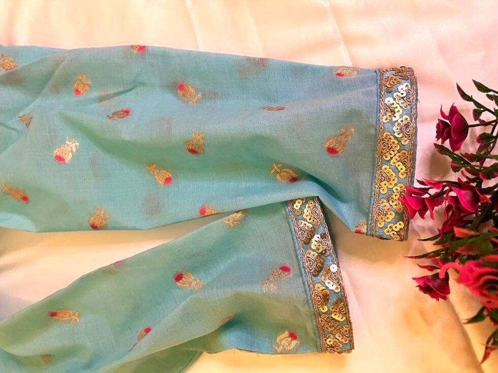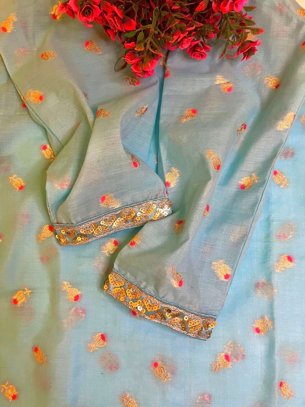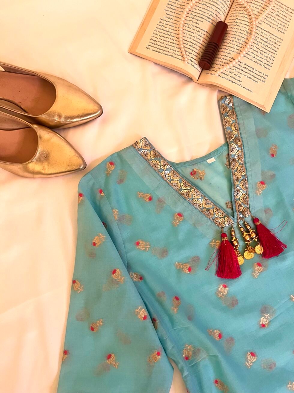 - This stunning sky blue raw silk kurti features an intricate all-over butti design, adding a touch of traditional charm and sophistication to your wardrobe.
