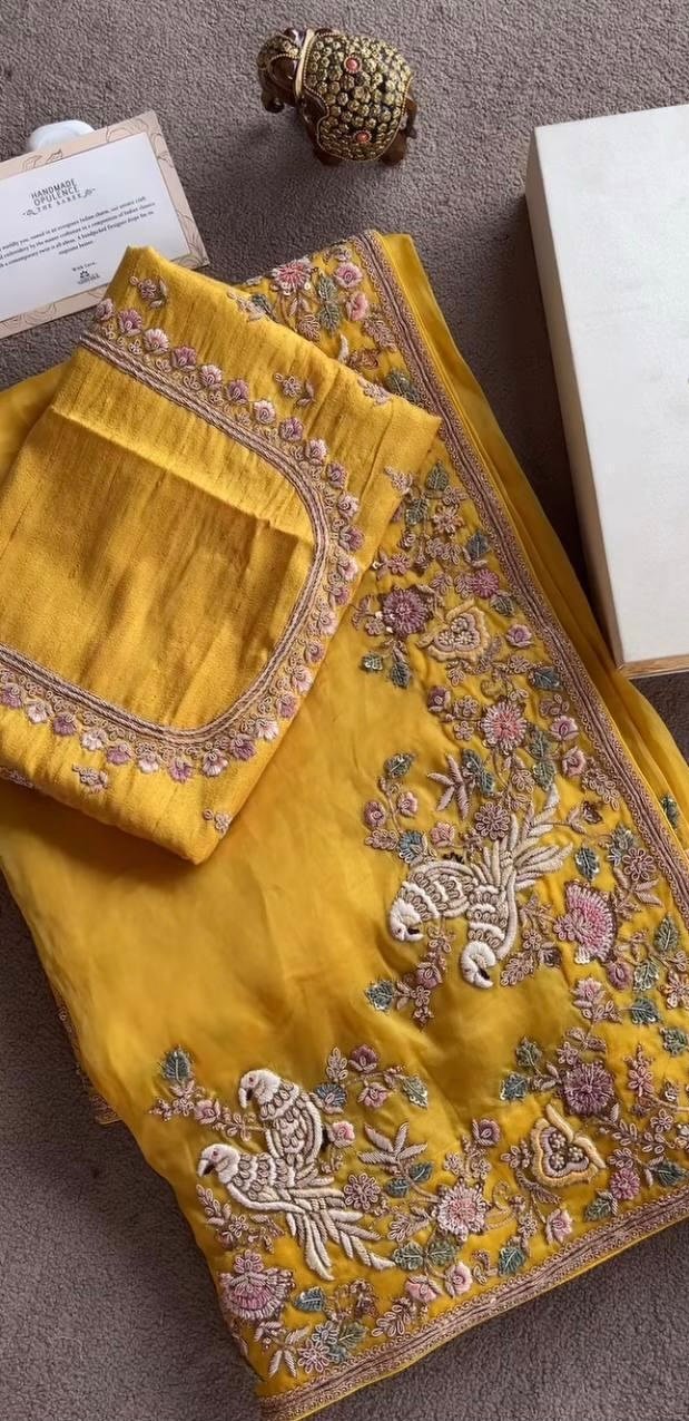 - This vibrant yellow dola silk saree features intricate floral patterns, complemented by charming birds, leaves, and stems, creating a captivating design that celebrates the beauty of nature.