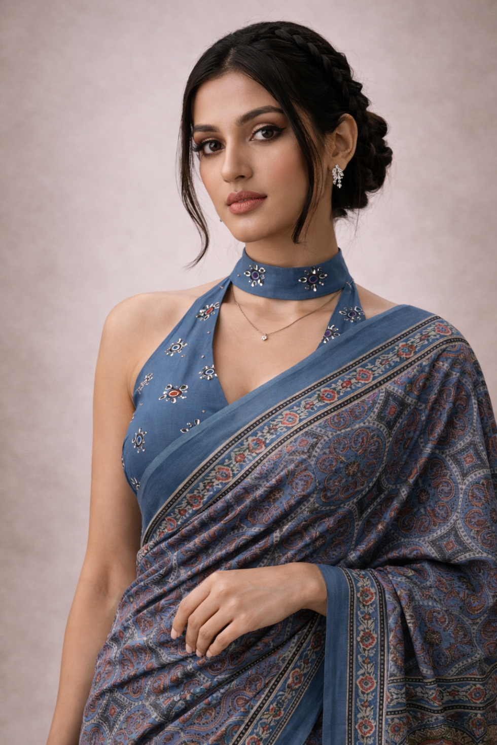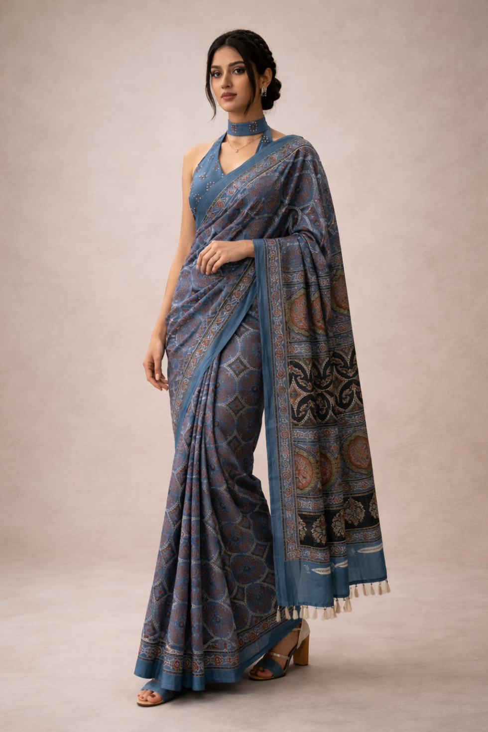 - Contemporary Styling & Details: The saree is paired with a modern halter-neck blouse featuring a matching choker collar, creating a sophisticated fusion look. The pallu (decorative end) is finished with delicate cream-colored tassels, adding a playful yet refined touch to the drape.